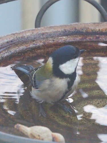シジュウカラの末っ子ちゃん 1度目の水浴びトライでは、腰が引けてましたが すぐに戻って来て さあ、2度目のトライはどうよ!? 先ずは、ちょっとだけバードバスに浸かって… よしっ! ここからボッチャンとお水の中へ!! 行かなかったかぁーー ほら、ここ…