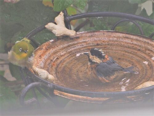 〈8月4日撮影〉 バードバスを奇麗にして お水を一杯にしたところで 早速、メジロがやって来ましたが… 先客のシジュウカラに遠慮して しばらく隅っこで様子を見て とりあえずお水を飲むメジロ… そして、水浴びを始めたメジロを 追い払う様子もないシジュウ…